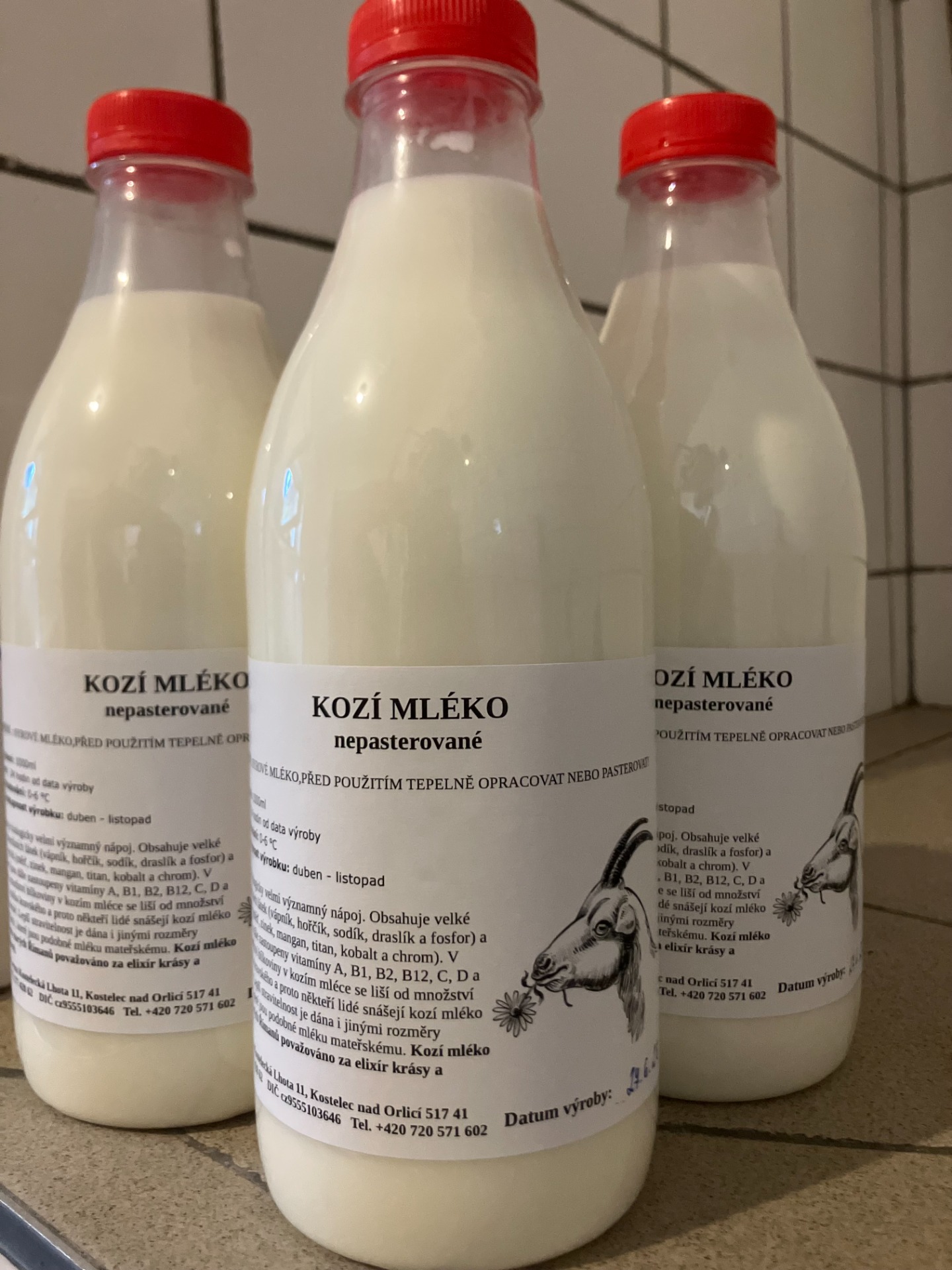 Kozí mléko prodáváme vždy čerstvé každý den. Jeho odběr je možný po předchozí telefonické domluvě. Prodáváme pouze do jednorázových plastových lahví o objemu 1000ml. Do vlastních nádob mléko neprodáváme.